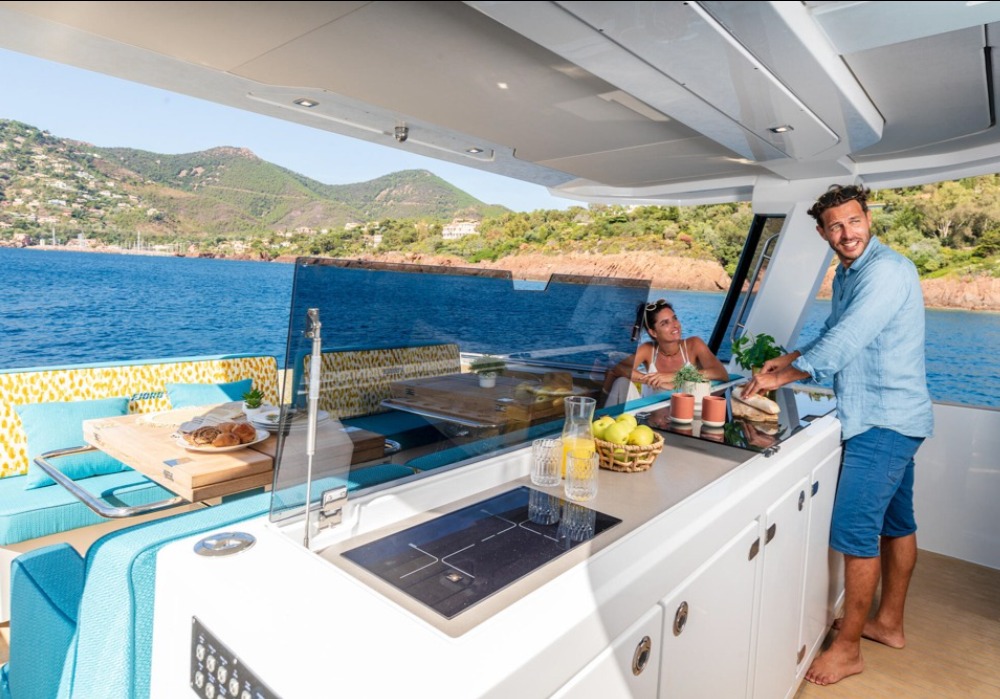 Welcome to your personal beach club! The spacious aft cockpit is divided into three distinct areas: four pilot seats at the helm, a well-equipped outside galley in the middle, and a C-shaped dinette aft with separate sun pad. Fold down side balconies create an enormous space for entertaining or easy access to the water, with a huge storage area beneath the aft sun pad for all the water toys you could wish for.